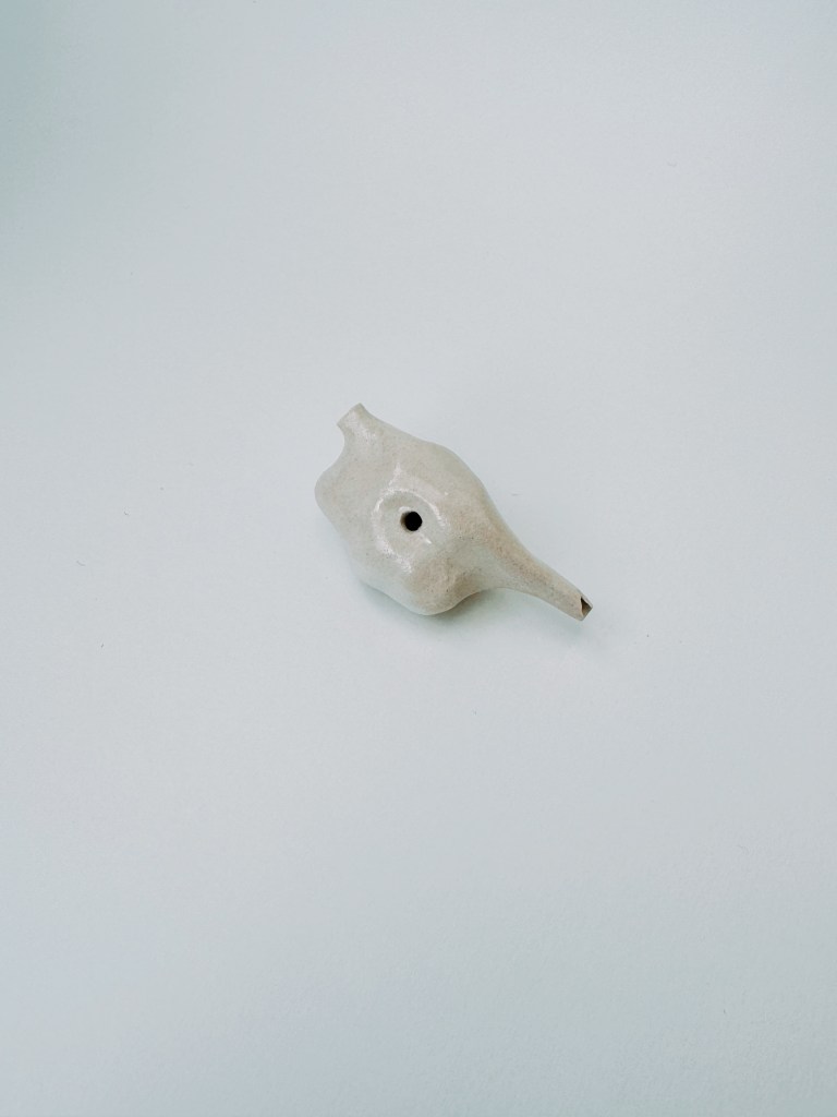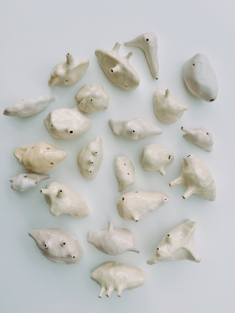 Champs d’oiseaux est une installation de petites sculptures en céramiques, dont certaines prennent la forme d’ocarinas – ces instruments anciens qui, soufflés, produisent un chant d’oiseau.