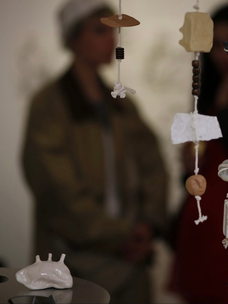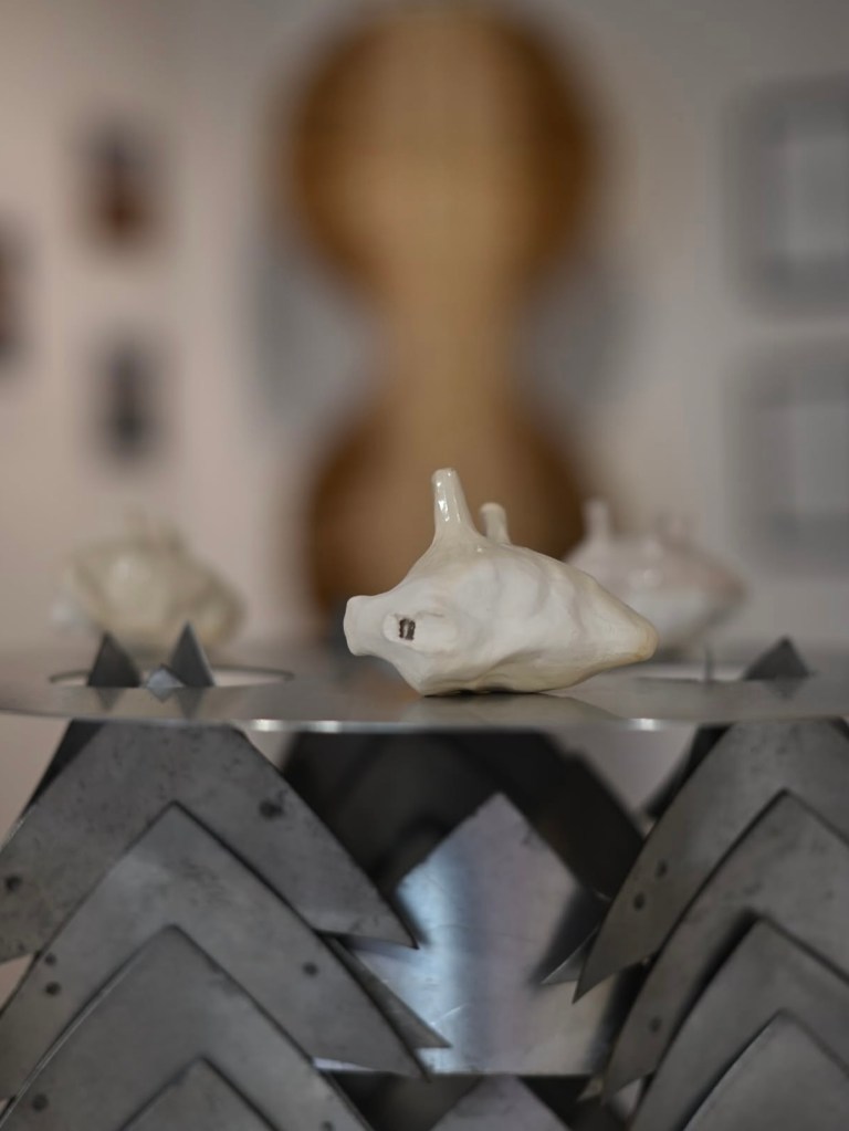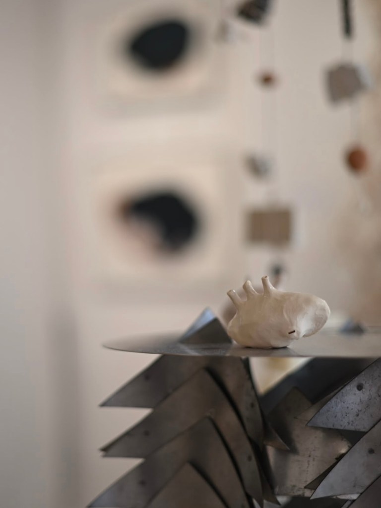 Chaque sculpture, à l’apparence fragile et anodine, aux teintes d’os comme blanchies par le temps, est un cri silencieux qui se love dans le creux de la main.