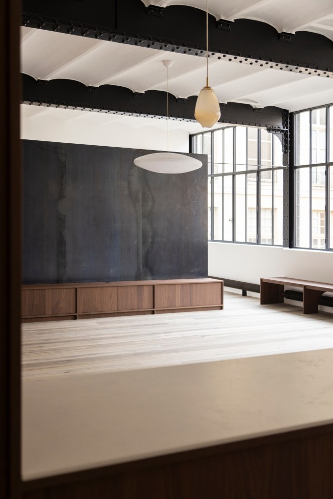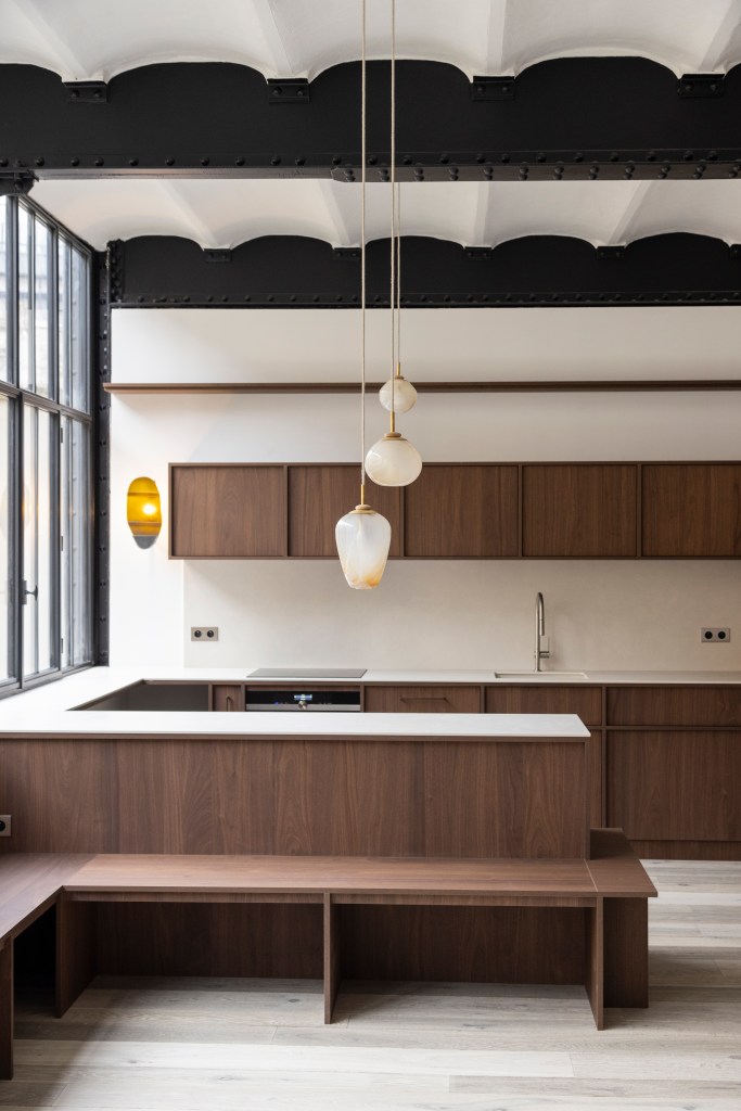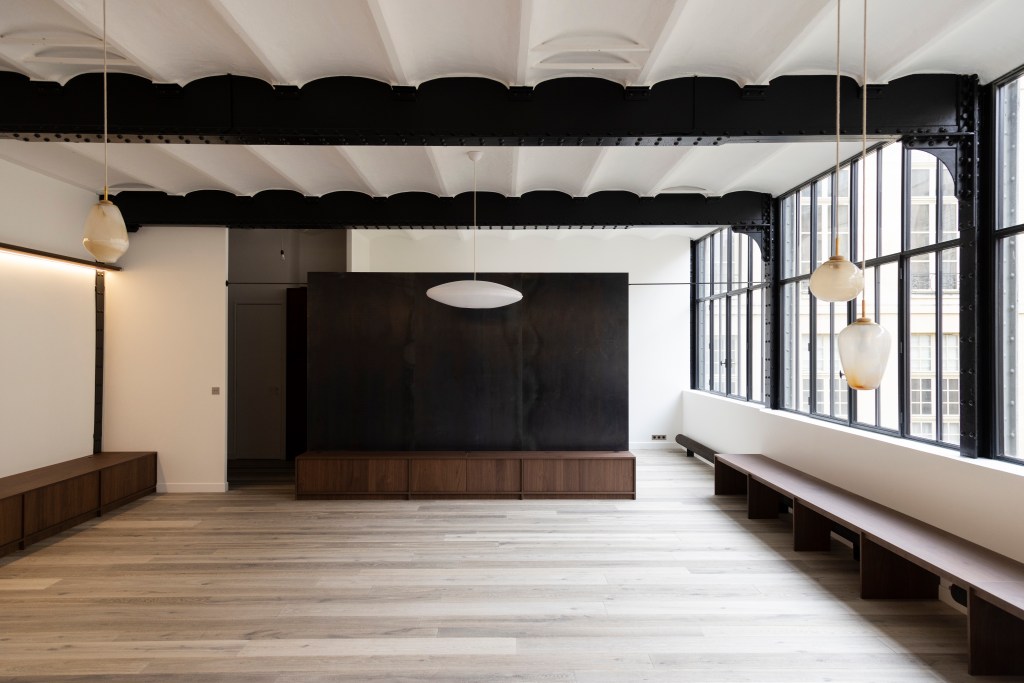 Se lovant dans l’aile d’une ancienne usine de jouets du 19ème siècle, l’espace est ramené à une forme de sobriété, esthétique et fonctionnelle. Les murs sont cernés de bois, à la fois assises et rangements : pour s’asseoir, s’allonger, poser un vase, quelques livres ou des pensées.