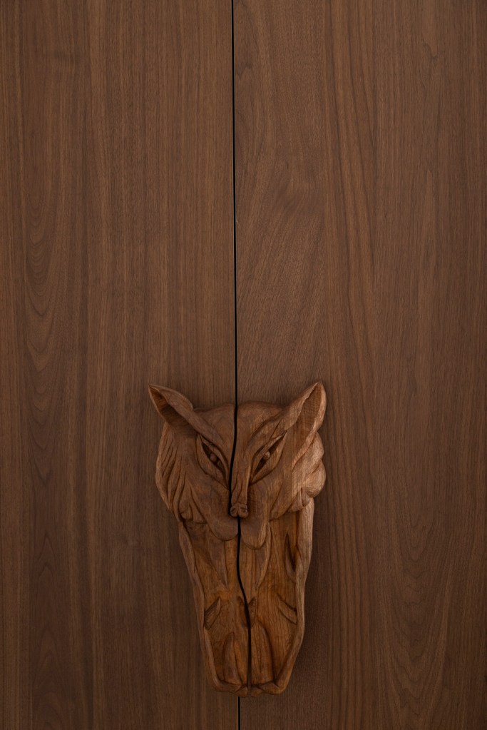 Le Gardien protecteur, mi-chien mi-loup, veille et accueille à l’entrée du lieu, taillé dans un morceau de noyer